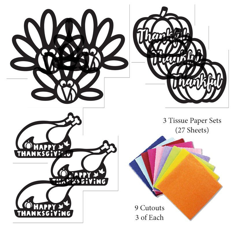 - [SUNCATCHER CRAFT – THANKSGIVING] Includes 3 Sets of 3 Precut Thanksgiving Templates and 3 Sets of 9 Assorted Color Tissue Papers.