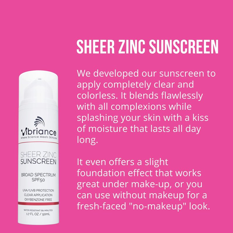 - INVISIBLE ON ALL COMPLEXIONS: Vibriance's Sheer Zinc SPF 50 Sunscreen applies completely clear, blending seamlessly with all skin tones. It offers a subtle foundation effect, making it ideal for use with or without makeup.