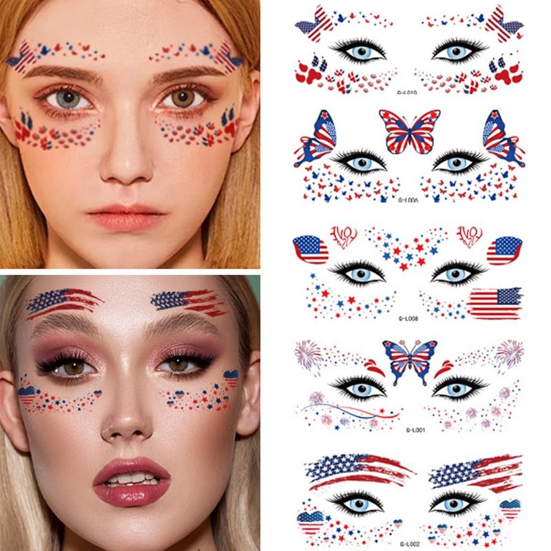 Independence Day patriotic temporary tattoos for adults kids exquisite waterproof tattoos Features: 2024 latest design, patriotic face tattoos with glow-in-dark effect High quality material, safe, non-toxic, odorless, durable and waterproof Easy to use and remove How to use: 1.Cut out the pattern 2. Remove the protective film. 3. Apply the fake tattoo on completely dry skin. 4. Wet the back of the white paper completely with water. 5. Tear gently after 20 seconds or more. How to Remove 1. Wipe the temporary tattoo with alcohol or make-up remover or cold cream or baby oil and wait 10 seconds. 2. Rub gently and repeatedly until the tattoo disappears or scrub it off with soap and water.