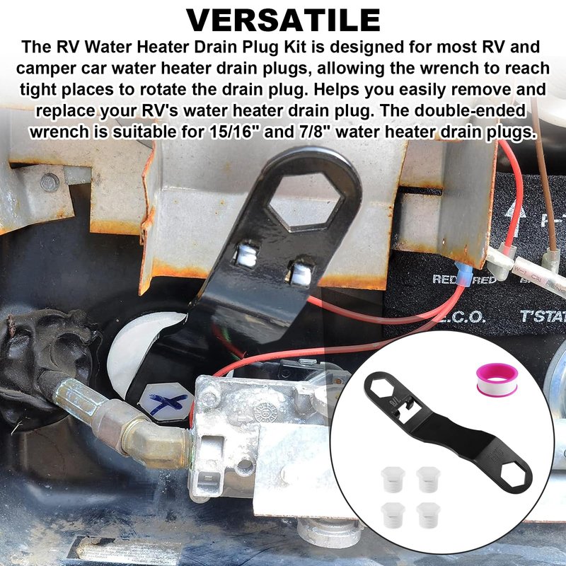 - 【Widely Used】The RV Water Heater Drain Plug Kit is designed to fit most RV and Camper Water Heater Drain Plugs, allowing the spanner to reach tight places to rotate the drain plug. Helps you easily remove and replace your RV's water heater drain plug. The double-ended spanner fits 15/16 inch and 7/8 inch water heater drain plugs.(6 pieces total)