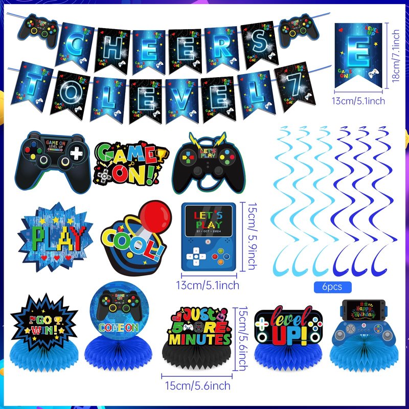 - 【Easy to Assemble】: The video game birthday party banner decorations come with a long rope, and there are 4 holes in the corner for you to hang it up. According to the instructions in the picture to install the video game hanging swirls streamers and honeycomb centerpieces, then string the LEVEL 7 Pre-Strung banner with ribbons. An easy and quick way to start your 7th birthday party