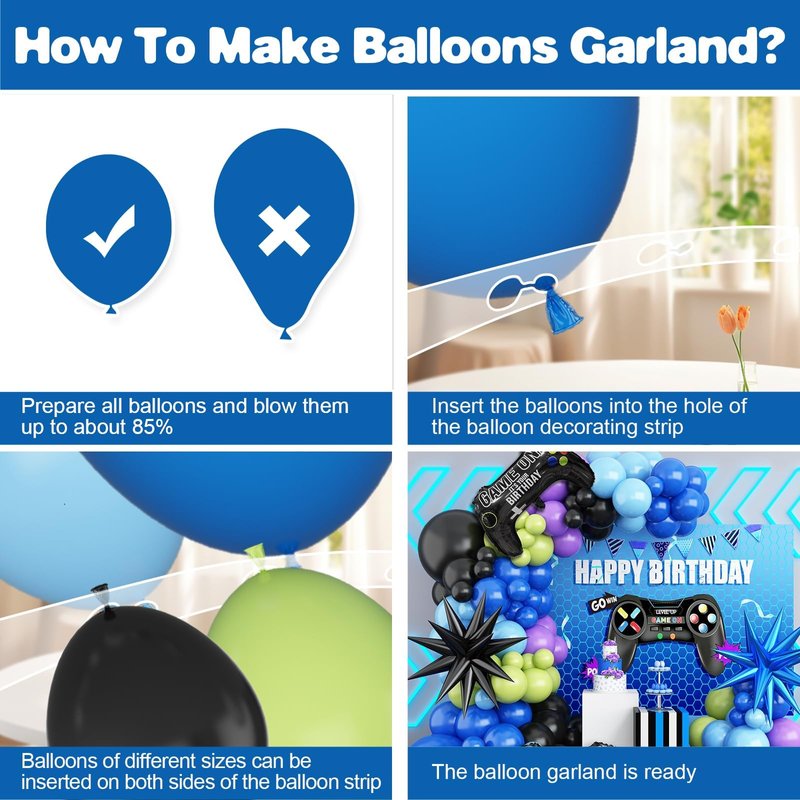 - 【Easy Assembly】Making an impressive blue green balloon garland is a breeze. Simply inflate the balloons to different sizes and easily secure them to the included arched balloon strips using the provided adhesive strips. Mix and match for a truly unique video game birthday party decor.