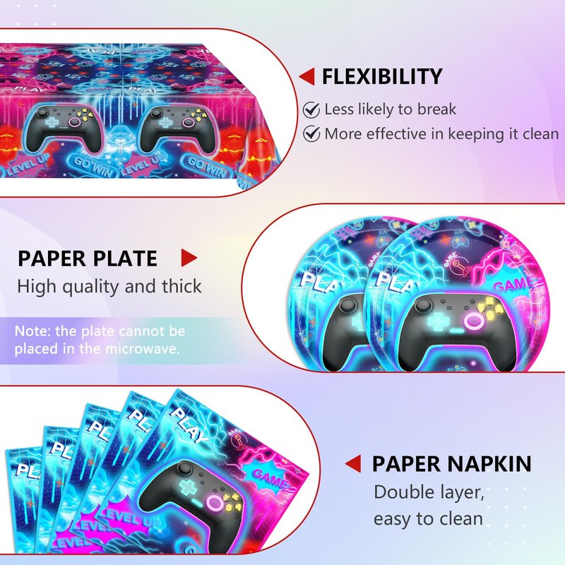 - 🎮High Quality:These gaming birthday decorations are made from high quality eco-friendly materials.The gaming party video game plates and napkins are made from high-quality paper that is tough,durable and not easily damaged. The gaming party video game tablecloth is made of environmentally friendly,non-toxic material to ensure food safety and make your boys birthday party more secure and secure!