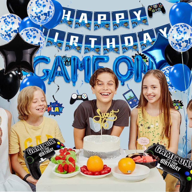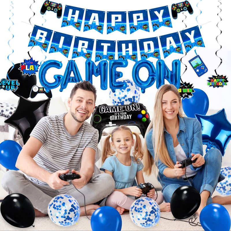 Video Game Birthday Party Decorations Navy Blue Game On Party Supplies Gaming Birthday Decoration Including Happy Birthday Banner,Hanging Swirls, latex balloons and Game Controller Balloons