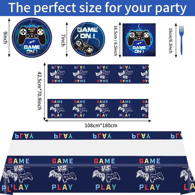 - Video Game Party Decorations Package: you will receive 98 pieces of game birthday decorations, including 2 Pcs video game tablecloth, cutlery sets for 24 guests including forks 7 inches dessert plates, 9 inches dinner plates, napkins