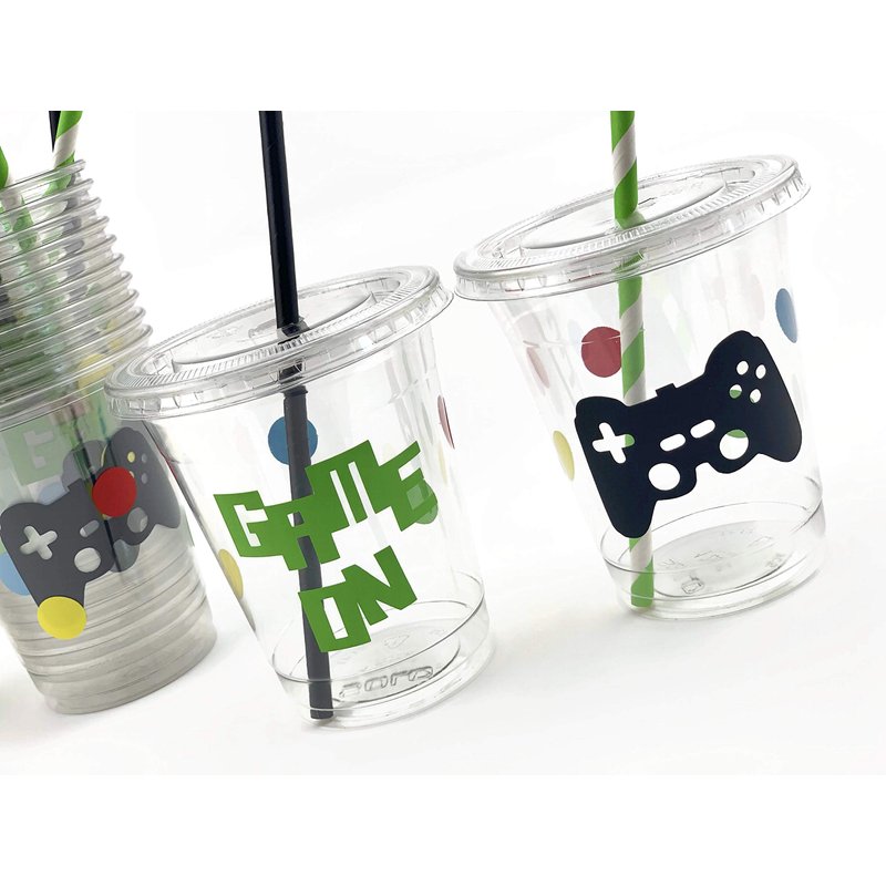 Celebrate your special occasion with these fun video game party cups! Includes a set of 12 Clear Soft Plastic 12oz Disposable Plastic Drinking Cups with Handmade Vinyl Decals, Clear Plastic Straw Slotted Lids, and Paper Straws. Handmade in Oregon, USA.