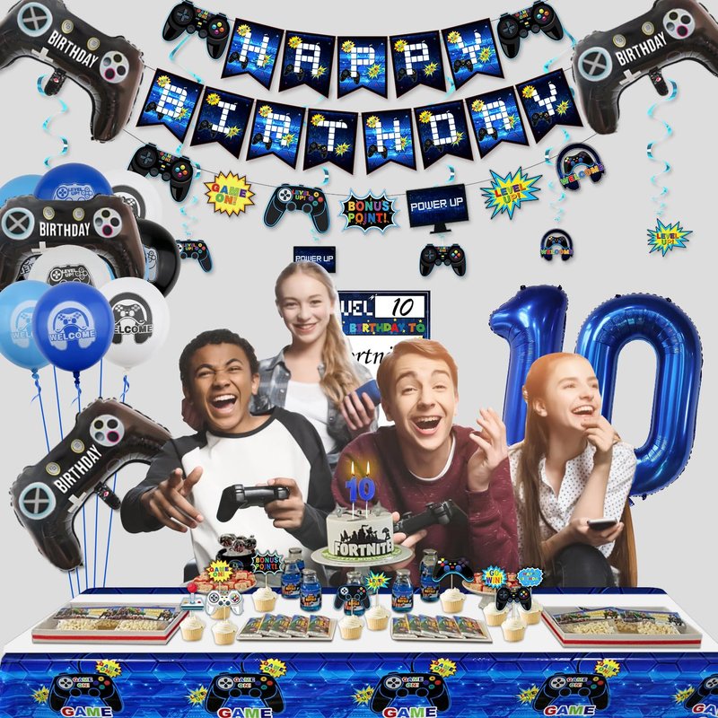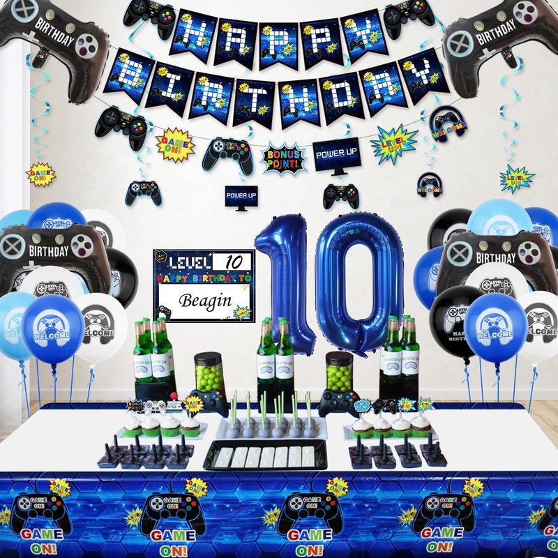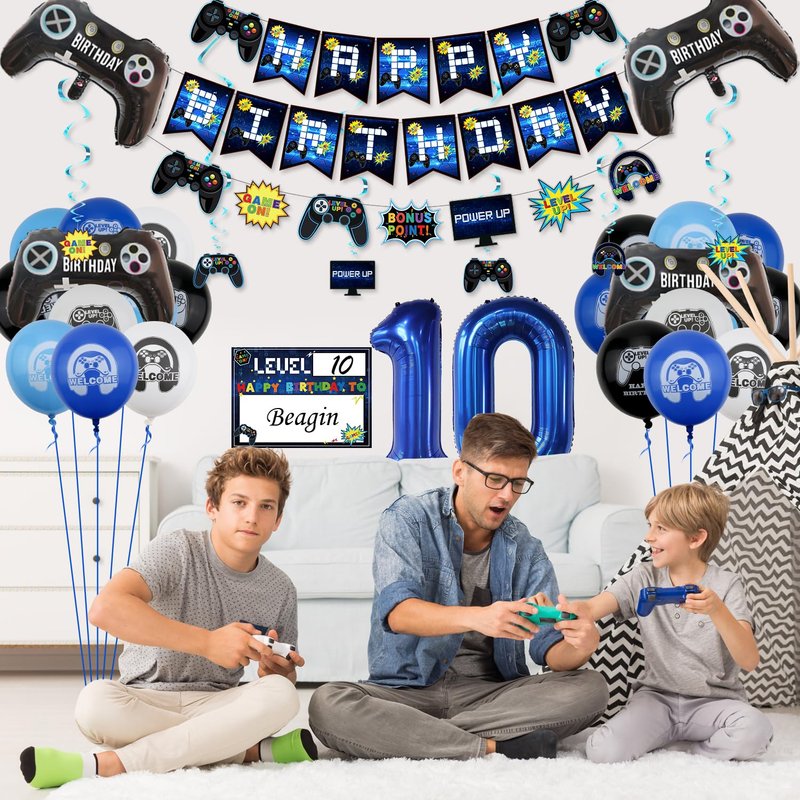 - 🎮Package Information: 3 set HAPPY BIRTHDAY banner and video game-themed banners, 1PC DIY name hanging sign, 6 Pcs hanging swirls, 10 Pcs cake toppers, 2 PCS controller balloons, 20 Pcs gaming theme latex balloons (light blue, dark blue, black, white, 5Pcs/color), 1 PC number 10 foil balloon, all in one pack video game birthday decorations for boys and girls, perfect for your little gamer's 10 year old birthday.