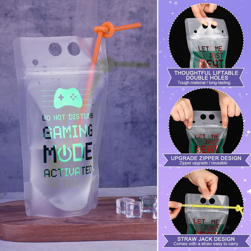 - Pouches for Drinks with Straws: there are 24 pieces of plastic pouches drink bags in the package, and equipped with 24 pieces of straws, which can satisfy your family video game theme birthday party uses and replacements, and are sufficient to treat your guests