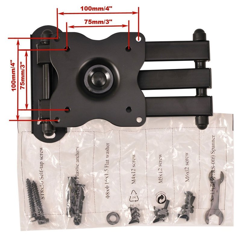 VideoSecu articulating wall mount for LED LCD TV Monitors, makes it easy to view your TV or Monitor from different angles. Fits TV or Monitor with VESA 100, VESA 75 mounting hole pattern (these are square or rectangular patterns between 3 and 4 inches per side on the rear of your display), maximum loading capacity 44 lbs. This dual link arm wall mount gives you 15" extension from the wall with maximum flexibility. You can also fold it close to your wall for a low-profile appearance. Detachable VESA plate lift and hook design makes for one-person installation. Post installation level adjustment to ensure perfect level. Tilt, swivel function provide smooth adjustment for all directions. Durable steel construction with black powder coated finish. Common mounting and screen attachment hardware included.