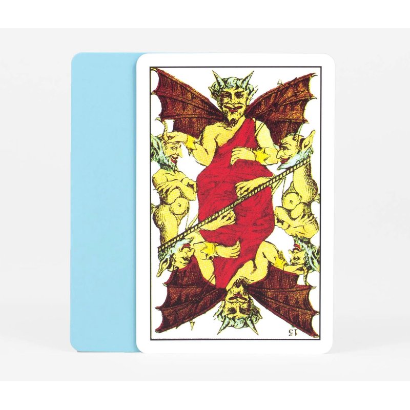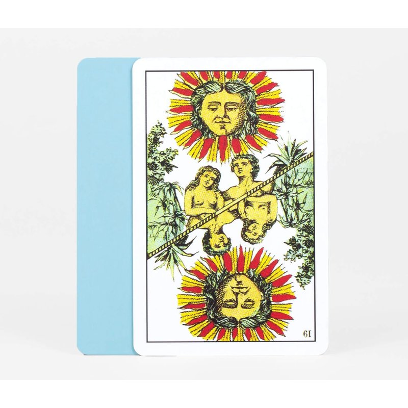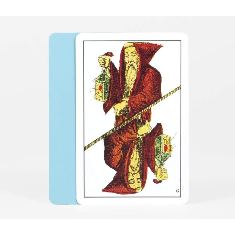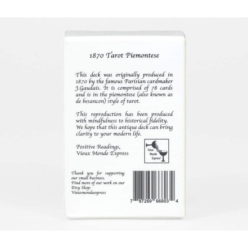 This deck was originally produced in 1870 by the famous Parisian cardmaker J. Gaudais. It is comprised of 78 cards and is in the piemontese (also known as the de besancon) style of tarot. This reproduction has been prodiced with mindfulness to historical fidelity. We hope that this antique deck can bring clarity to your modern life! - Vieux Monde