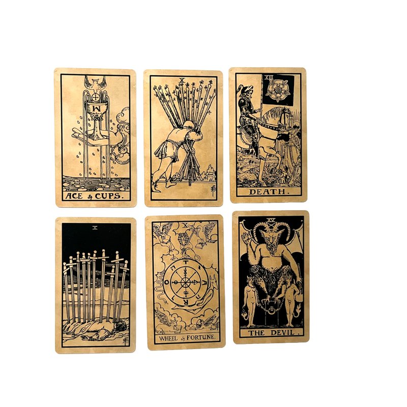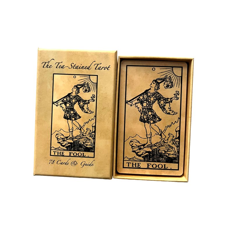- Classic 1909 Tarot Deck Design – This deck is a faithful recreation of the timeless 1909 Rider-Waite Tarot, offering the traditional and beloved artwork that has captivated tarot enthusiasts for over a century, just with a tea-stained spin!
