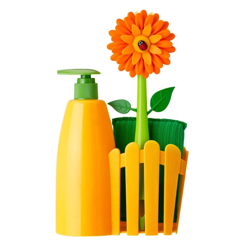 The Flower Power Orange Sink Side Set is a compact, multipurpose dishwashing bundle designed to keep countertops organized and clutter-free. Characterized by a fanciful floral theme, this playful product enjoys a pleasing color palette, from its sunny yellow caddy and matching soap dispenser to its daisy-shaped dish brush and grass green sponge. Behind the bright orange blossom sprouts a clutch of hardwearing nylon bristles that strip grease and grime without scratching sensitive surfaces; an extra-long, ergonomic handle offers optimal comfort. The picket fence storage tray keeps sponges, scrubbers, and scrapers all in one convenient spot, while discreet drainage holes let lingering water droplets flow back into the sink.