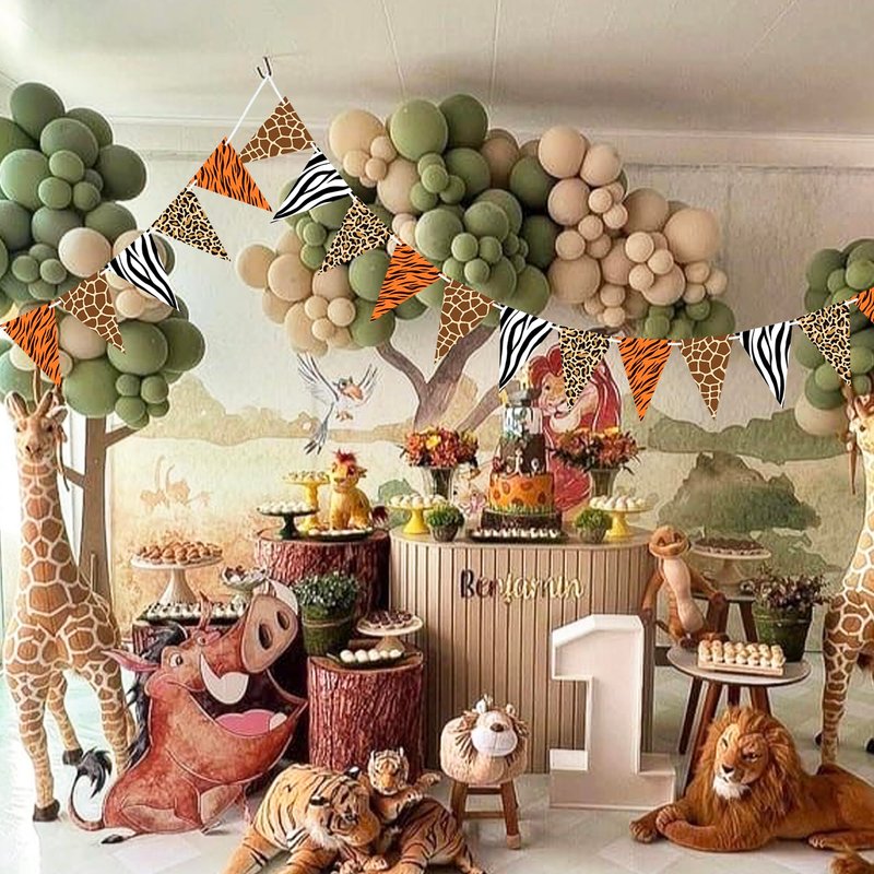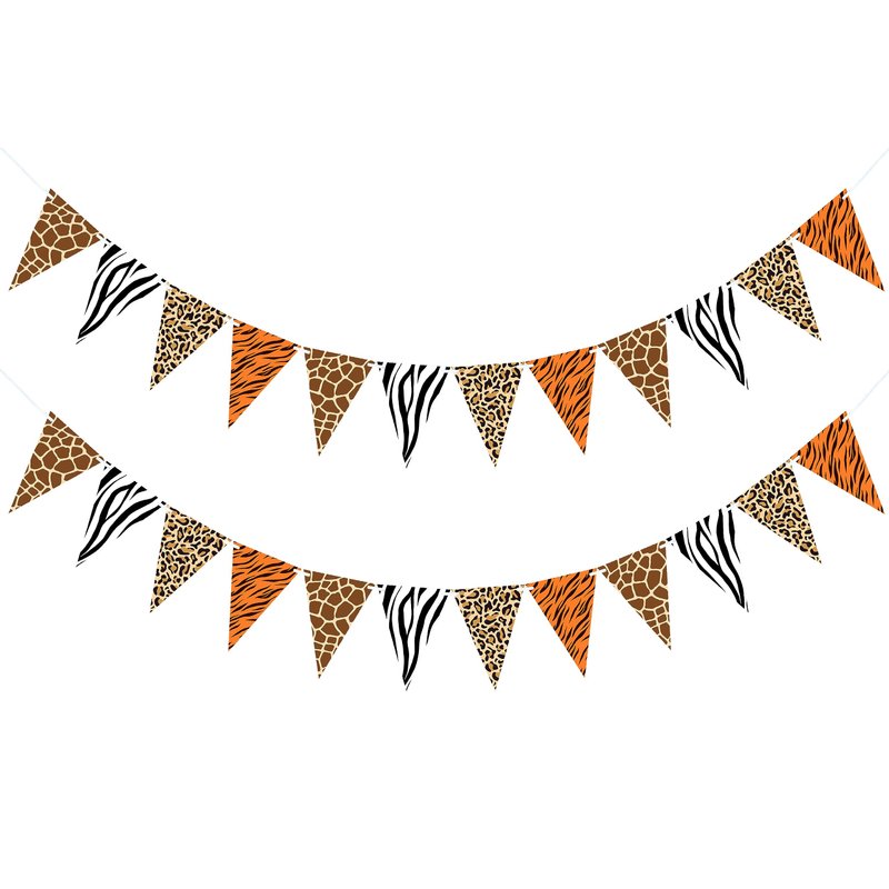 - The animal print party decorations are made of thick cardstock, DOUBLE-SIDED printing will complete jungle theme birthday decorations, the party banner is 9.8 feet long and each triangle flag is 5.5 x 7.8 inches, each string contains 12 triangle flags, total 24 flags.