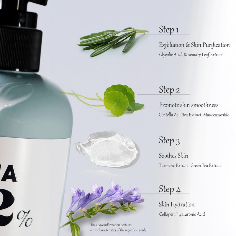 - NATURAL INGREDIENTS: Formulated with natural ingredients that have a variety of benefits. Glycolic Acid removes the dead skin cells, and Madecassoside helps skin regeneration and soothing. Green Tea Extract & Skullcap Extract provide antioxidant properties. Squalane, Hyaluronic Acid, Rosemary, Collagen, and Devil's Claw Root Extract give moisture and elasticity. Finally, Centella Asiatica provides soothing effects