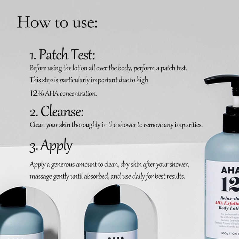 - REJUVENATING: Body lotion for effective peeling with AHA 12 %, maintaining pH balance. Even with a 12 % Glycolic Acid Solution, pH 3.0~4.0 balance prescription removes dead skin cells without irritating the skin