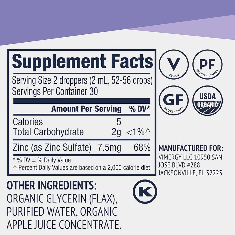 Vimergy Organic Zinc Supplements for Women & Men (7.5mg Liquid Zinc Per Serving) Fast-Absorbing Immune Support, Promotes Healthy Bones & Skin, USDA Certified Organic, Vegan, Up to 27 Servings (55 mL)