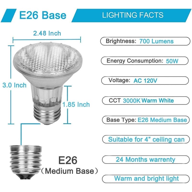 - 4,【Standard PAR20 E26 Base】: 40 degree narrow flood beam angle for a more concentrated lighting, you can highlight the areas that you want to light up, our par20 halogen flood light with standard E26 medium base perfect replacement for track light bulbs, range hood light bulbs, accent light bulbs and so on.