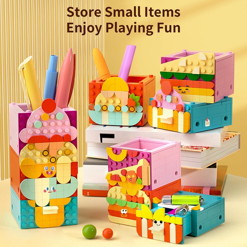 - Stackable Drawer Design: This building blocks set includes 400+ pieces.3 different model combinations to build: ice cream pen holder,hamburger drawer,desserts drawer.Come with detailed instructions and DIY decoration stickers.Design your own drawer as you want.It can provide hours of building fun,develop spatial imagination.