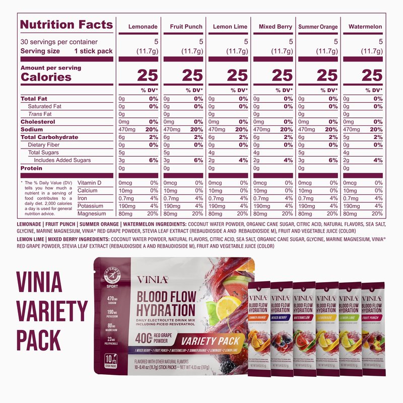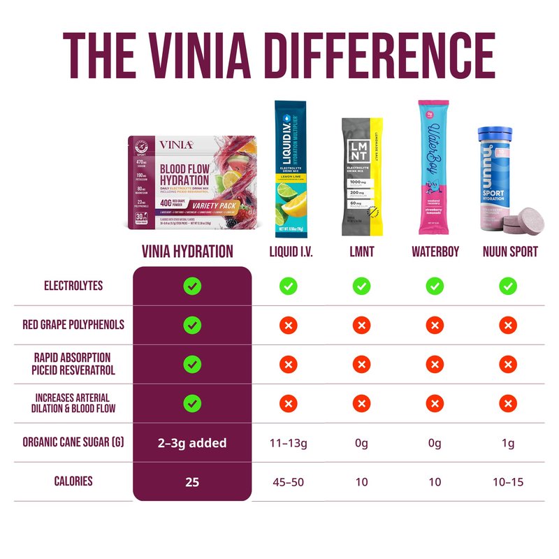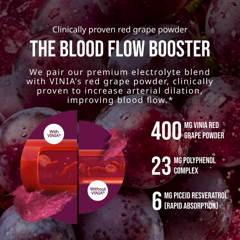 - DEEP CELLULAR HYDRATION: Real hydration isn’t just about drinking water. It’s about how effectively your body absorbs and distributes what you drink. VINIA Blood Flow Hydration pairs premium electrolytes with our clinically studied red grape polyphenol complex to boost blood flow, helping you stay energized and alert.*