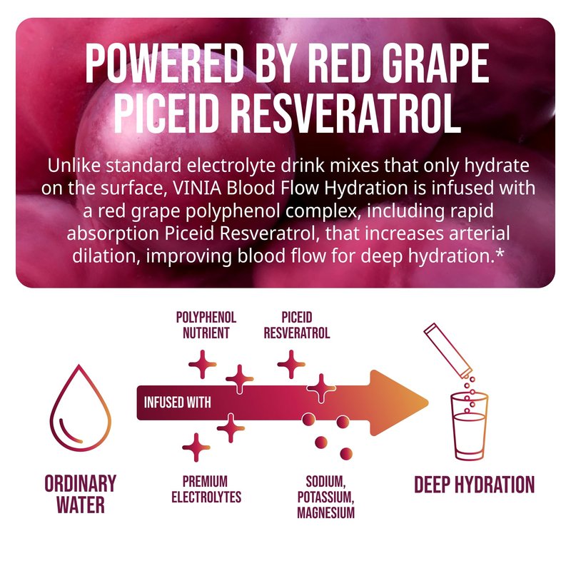 VINIA Blood Flow Hydration is the first and only 2-in-1 blood flow-driven functional hydration solution that pairs premium electrolytes with clinically studied red grape polyphenols, including rapid absorption Piceid Resveratrol. Together, they increase arterial dilation and boost nitric oxide production. This helps improve blood flow so nutrients, electrolytes, and hydration reach deep into your muscles, organs, and cells—something ordinary hydration powders can’t do. Most hydration drinks only replace what you sweat out. VINIA Blood Flow Hydration boosts circulation to help hydration work better from the inside out. This marks a new era in blood flow-driven hydration science.