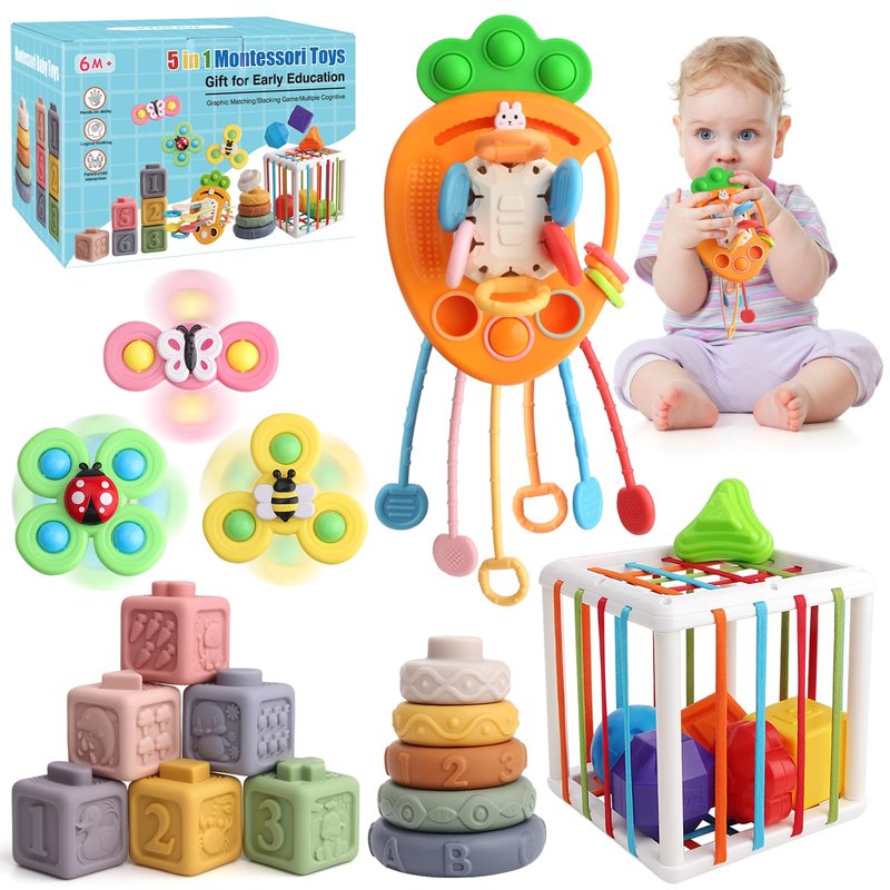 - 5 In 1 Montenssori Toy Set - Full Set High quality Montessori baby toys total including 6x Building blocks, 5x Stacking rings, 3x Suction cup spinners, 1x Cube bin, 6x Shape sorters, 1x pulling string. Keep your baby occupied and fully meets your toddlers' montessori learning exploration and enjoyment.