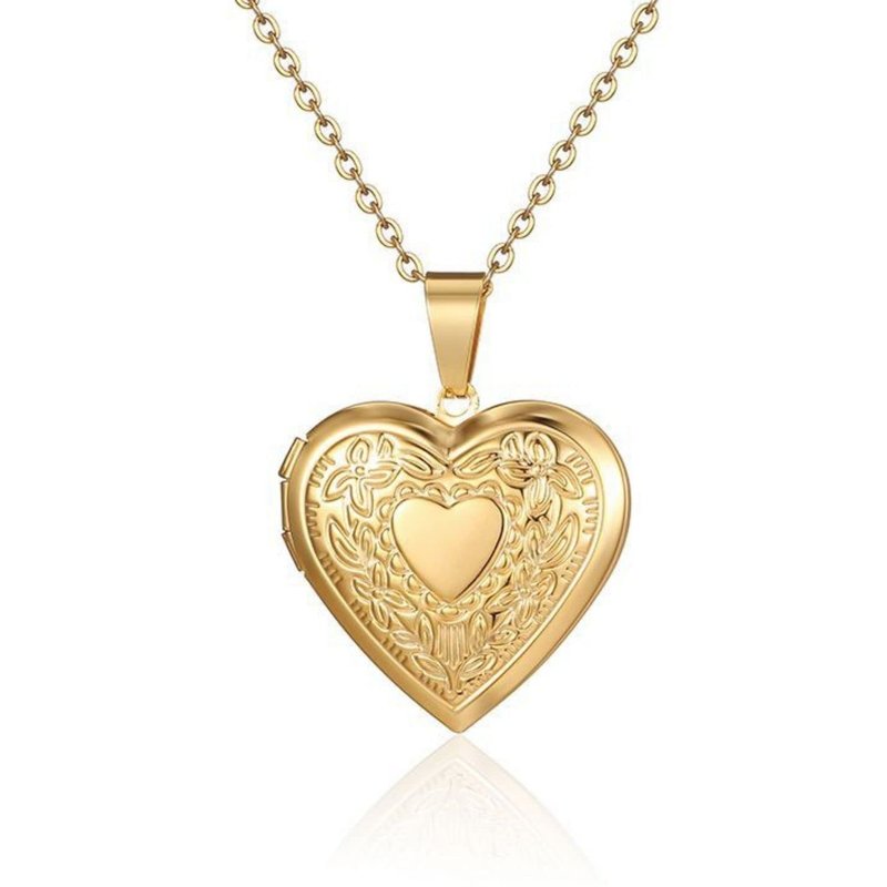 Vintage Engraved Flower Locket Picture Pendant Necklace Antique Carved Pattern Oval Heart Pendant Necklace For Women Girls Hold Picture Souvenir Memorial Jewelry(Gold Heart 1)