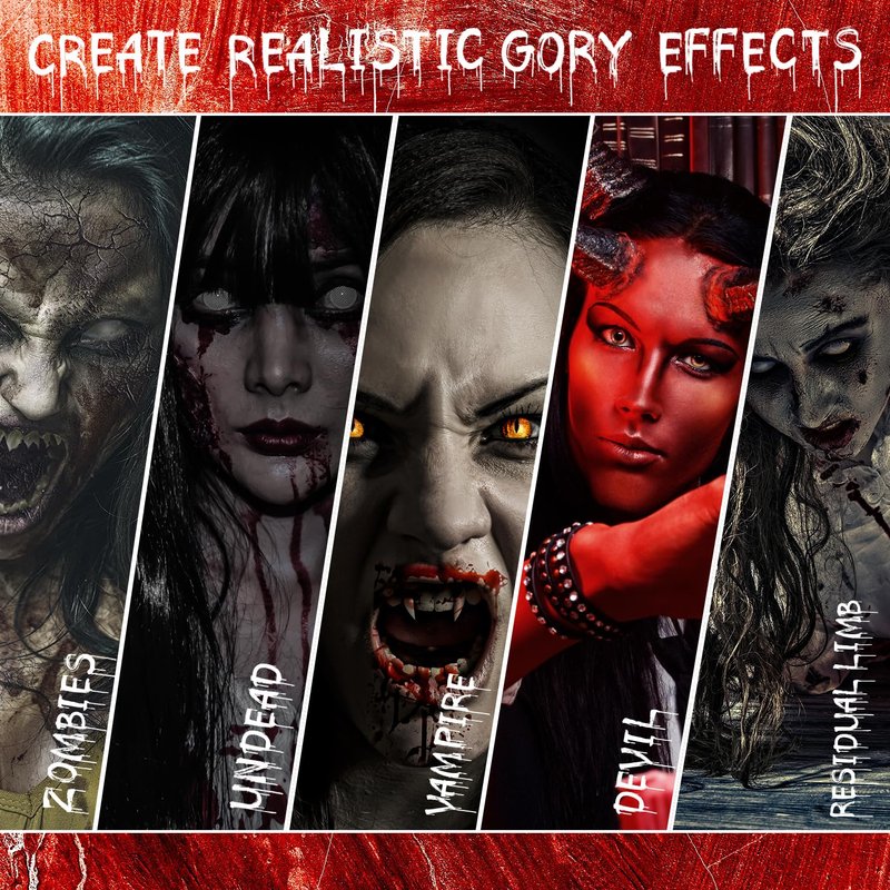 - Realistic Fresh Fake Blood - Super soft and sticky stage blood. Ideal for creating a range of realistic and fresh looking injuries.Excellent pigmentation to create realistic blood flow and consistency. Non-drying fake blood with a syrupy consistency. It continues to drip, so it's great for eye blood, eye drops and nosebleeds. It is safe for mouth and edible.