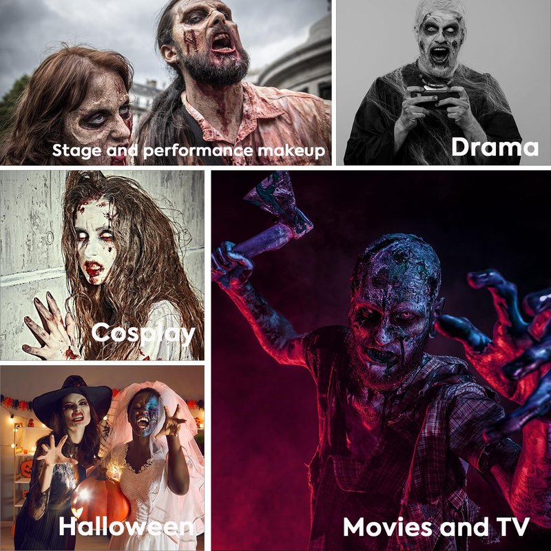 - Wide Occasions - You can use this rotten rotten latex skin makeup kit for countless purposes. First of all, you will stand out at Halloween themed parties. Also, you will catch everyone's eyes at theatrical performances and artistic shows. You can use this special Halloween prosthetic makeup kit to create fun pranks or organize unique photo shoots and video projects.