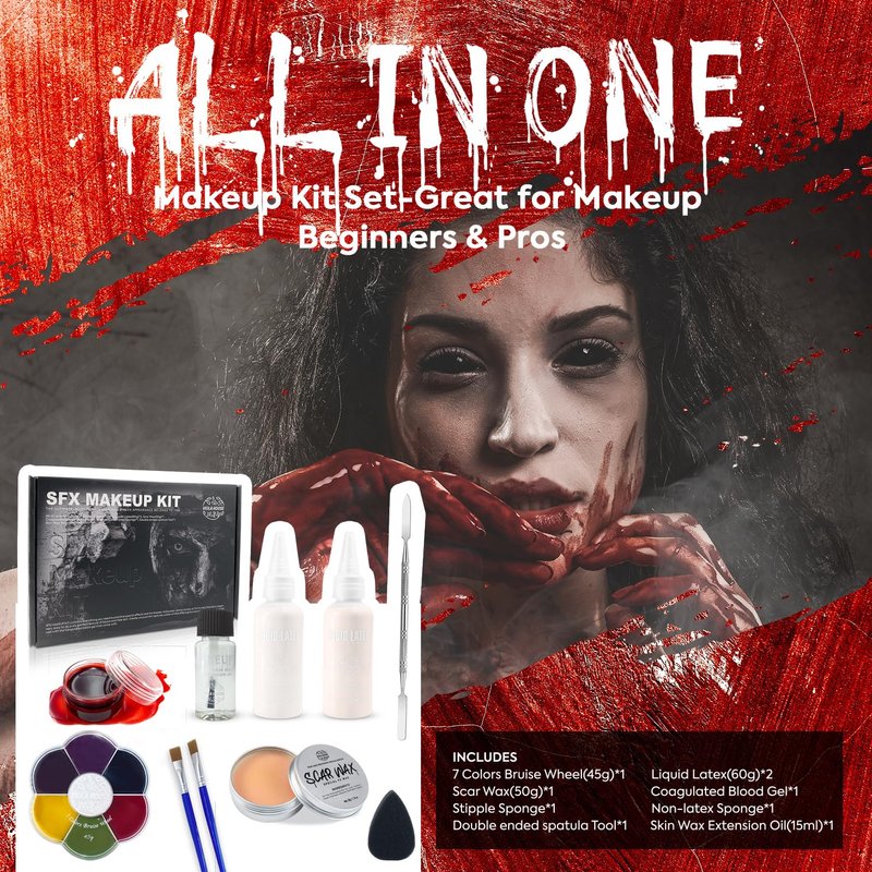 - 2 types of liquid latex - to meet your requirements for different skin colors. Let your imagination and creativity run wild. This liquid latex makeup kit is just what you need to shock and scare everyone! Create a makeup effect with dead, rotting skin that will make everyone scream. People will have a hard time even looking at you! The ultimate scary Halloween look is yours.
