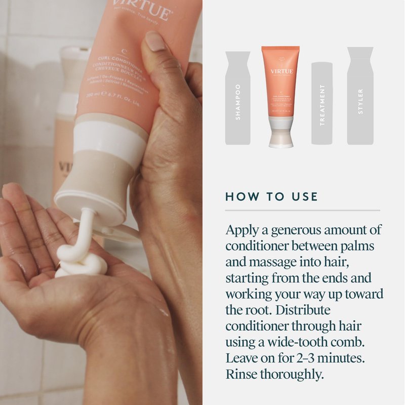 Virtue Curl Conditioner weightlessly detangles, de-frizzes, nourishes, and hydrates without weighing down curls. It repairs cuticle damage, rejuvenates elasticity, and protects against humidity, heat, and environmental damage for soft, silky, and strong curls. Virtue’s Alpha Keratin 60ku works with specially chosen hydrators and curl-optimizing polymers to facilitate natural curl patterns while repairing brittle hair that’s more prone to breakage.