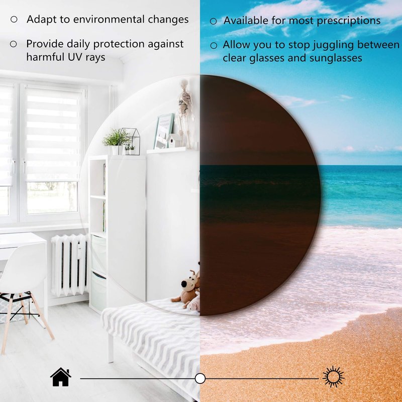 - Protective Lens - These sunglasses are superior to the previous type of sunglasses in three ways - when moving indoors or outdoors, the lenses adjust to the reduced light conditions automatically. And secondly, the lenses reduce flare and glare. Meanwhile, 100% UV protection layers against harmful UVA/UVB Rays