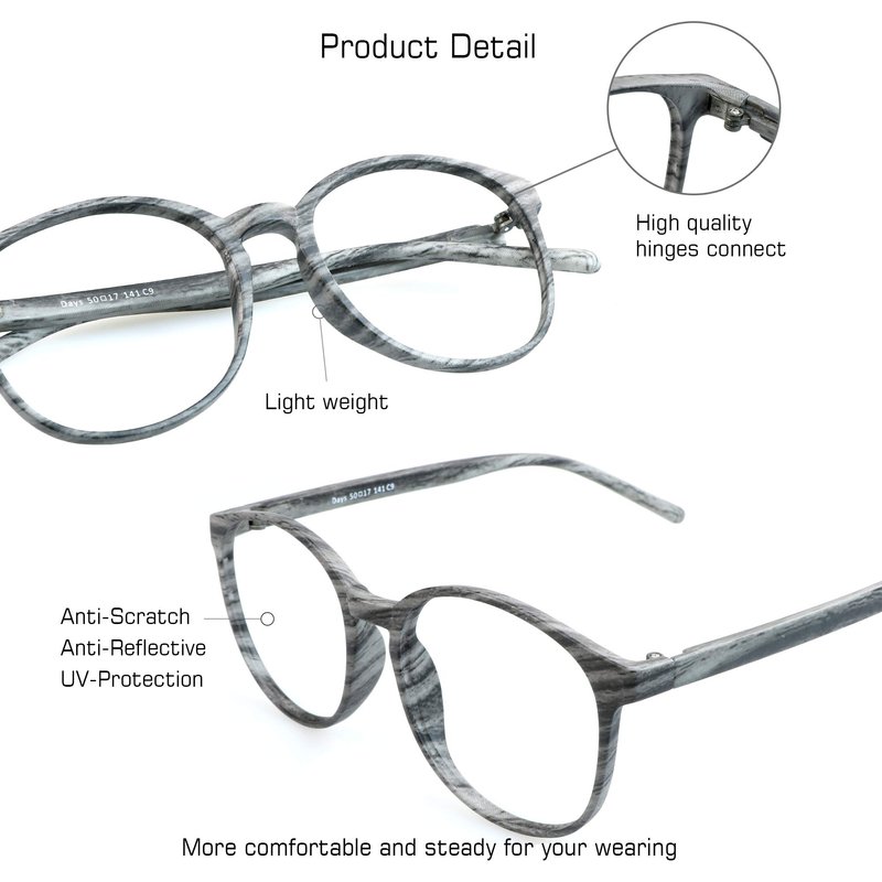 - Material:10g, ultra lightweight, frame TR90, no pressure on ears for long time wearing. Lens Resin. Oval shaped frames with a wood pattern, crafted from lightweight yet durable TR90