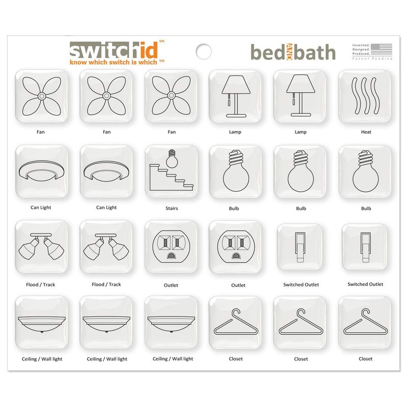 Eliminate confusion with SwitchID light switch labels and light switch stickers used to identify household appliances. SwitchIDs are high-quality product enhancements to your home! They provide an elegant and functional answer to the question: Which switch is which? This SwitchID edition is specifically designed for your Bedroom and Bathroom switches. It includes options for typical switches you find in this area if your home, Airbnb or VRBO.