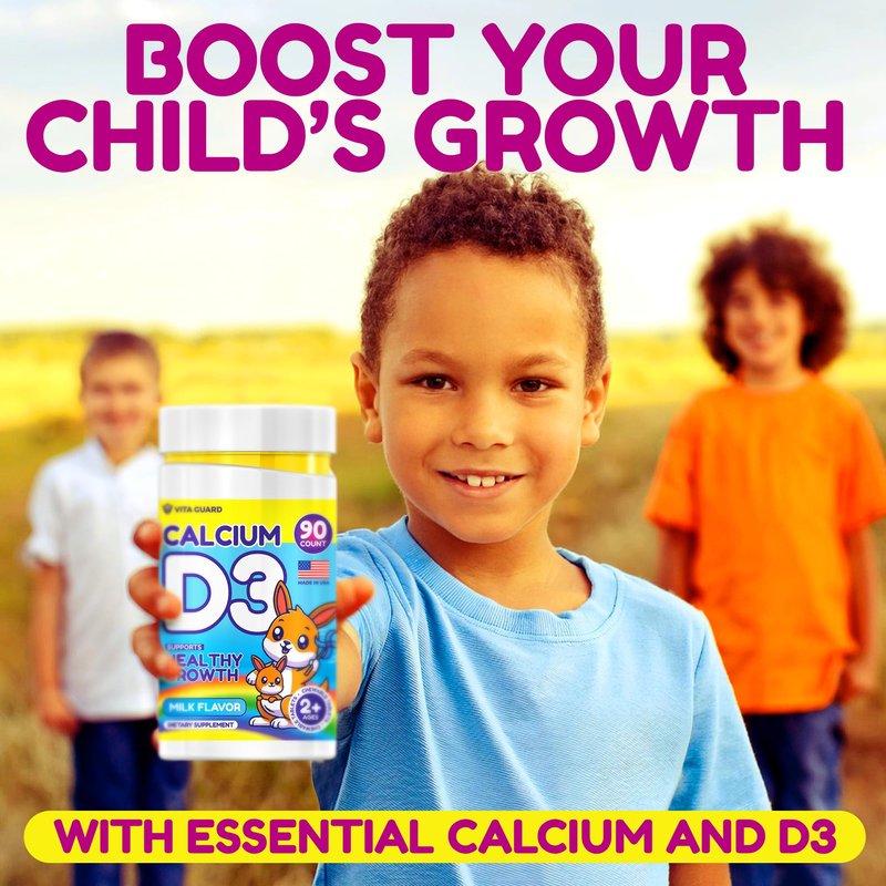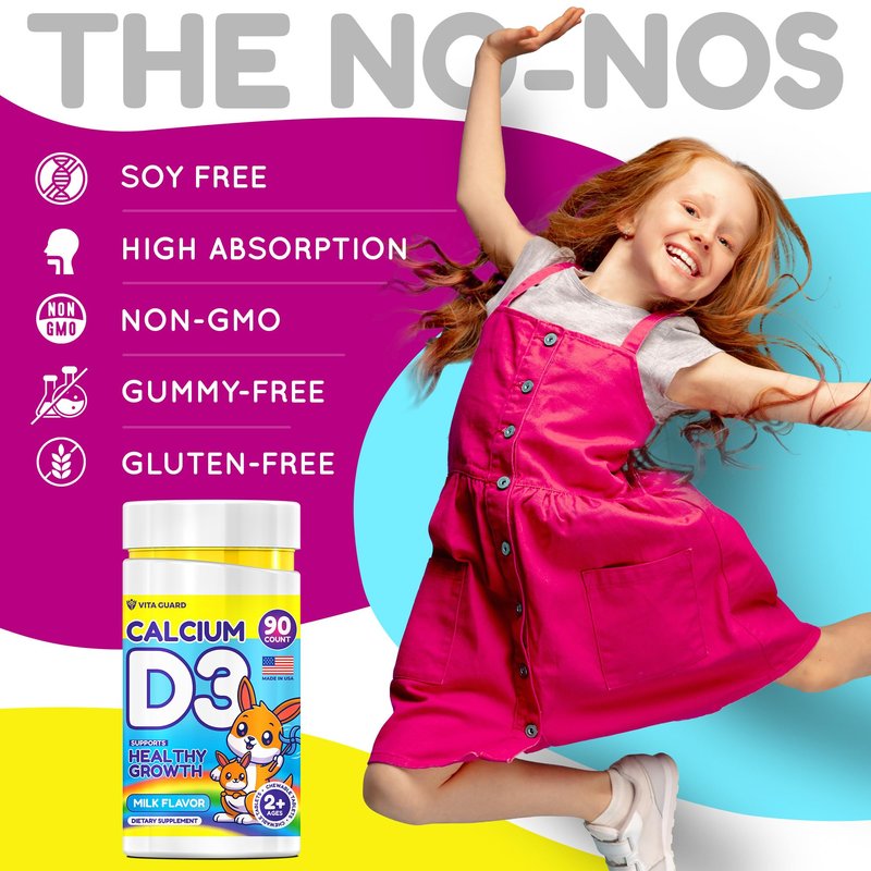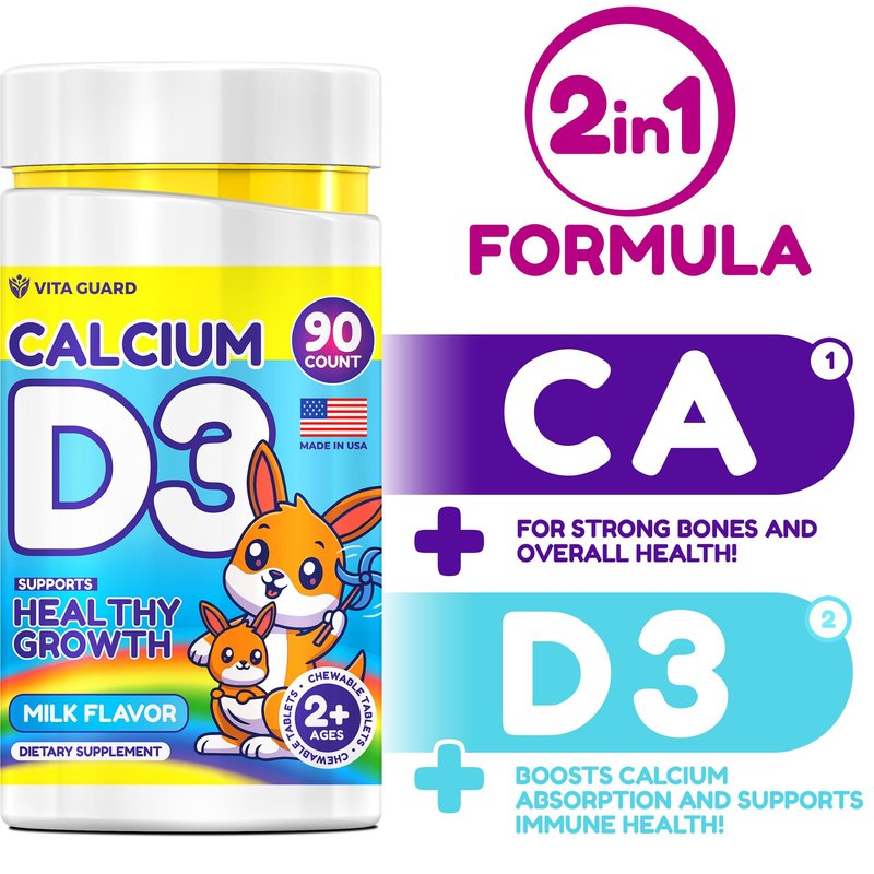 Vita Guard Calcium D3 Chewable Tablets for Kids are designed to support healthy growth and development in children aged 2 and up. Each serving provides 640 mg of Calcium and 320 IU of Vitamin D3, essential nutrients for promoting strong bones and teeth. These milk-flavored, oval-shaped chewable tablets are kid-approved, making daily supplementation both enjoyable and easy. Formulated to be gluten-free, non-GMO, dairy, soy, and artificial colors, these tablets cater to various dietary needs while ensuring high-quality ingredients. Manufactured in the USA under stringent quality standards, Vita Guard Calcium D3 Chewable Tablets offer parents peace of mind, knowing they are providing a safe and effective supplement for their child's daily health regimen. With 90 tablets per bottle, this supplement is an excellent addition to your child's diet, delivering the necessary nutrients during crucial developmental stages. The immediate release formula ensures quick absorption, supporting your child's health effectively and efficiently.
