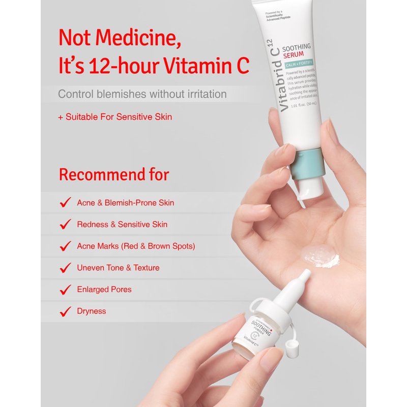 - SOOTHING SERUM FOR SENSITIVE, ACNE-PRONE SKIN: The VITABRID C12 12 Hour Vitamin C Soothing Serum is meticulously formulated for those with sensitive and acne-prone skin. Our unique formula with Vitabrid CG delivers vitamin C steadily over 12 hours, reducing redness and blemishes for a healthier complexion.