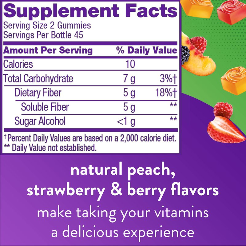 - Includes: One 90 ct bottle of vitafusion Fiber Well Sugar Free Fiber Supplement, Peach, Strawberry and Blackberry Flavored Supplements (45 Day Supply)
