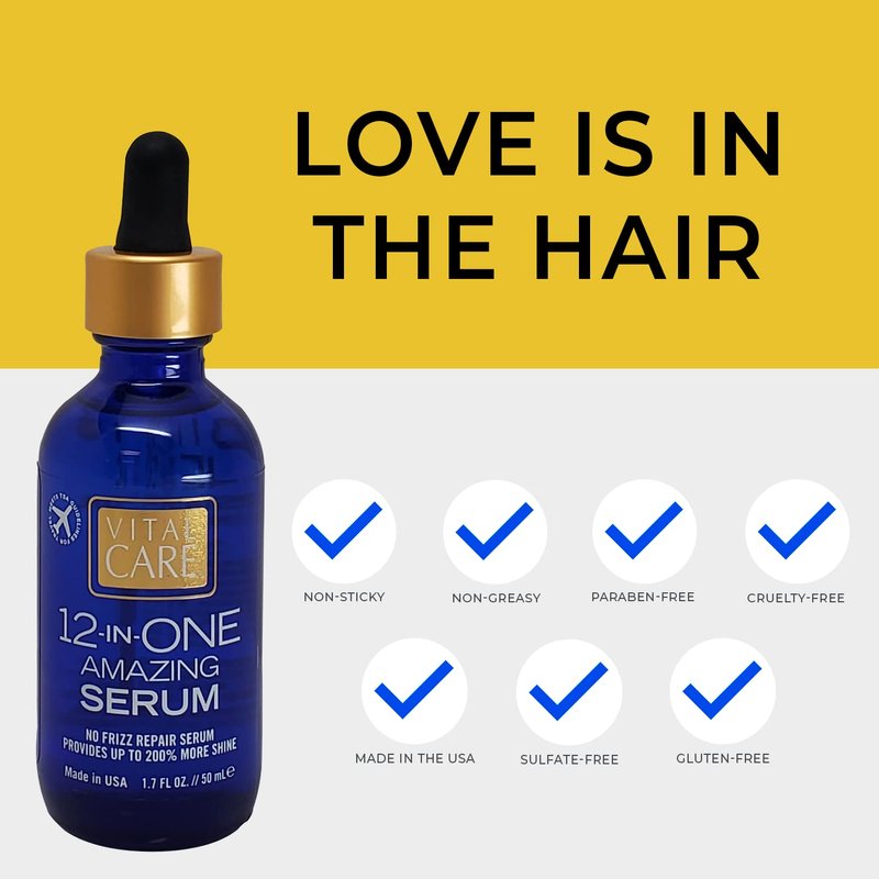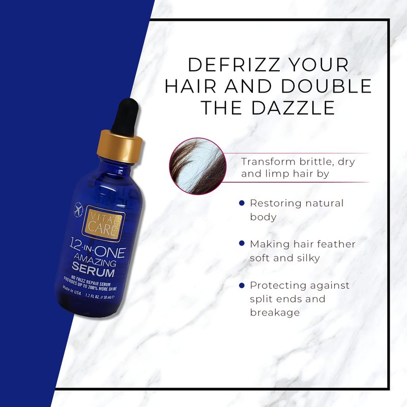 - Vital Care 12-in-ONE Amazing No-Frizz Serum: Infused with Abyssinian Oil, our amazing, no-frizz repair serum gives your hair more shine, while providing light hold and body. A little bit goes a long way—just distribute a few drops to boost body, tame strays, protect from UV and heat, and increase shine. TSA-approved 1.7 oz glass bottle with dropper.