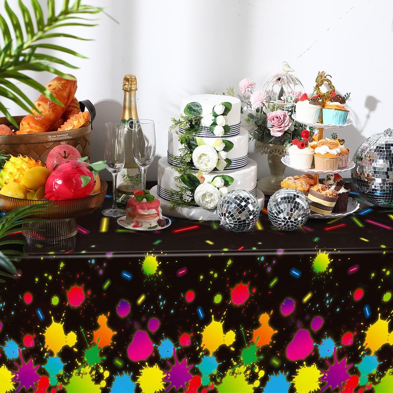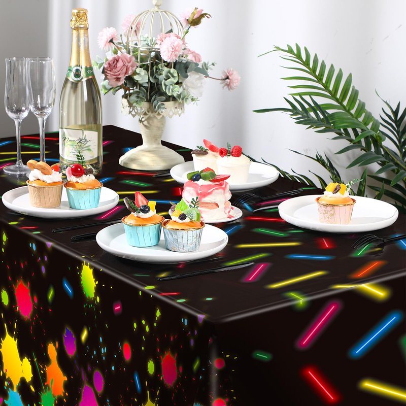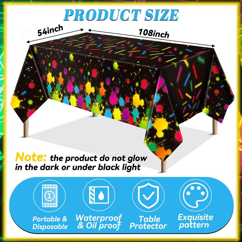 - Eye Catching and Stylish: the disposable table cover, adorned with vibrant neon paint splatter and glow stick patterns against a contrasting black background, grabs attention effortlessly with its stylish and colorful design; This lively and energetic design can instantly uplift the atmosphere of your gatherings, boost the fun factor and enhance your guests' enjoyment during their time at the event