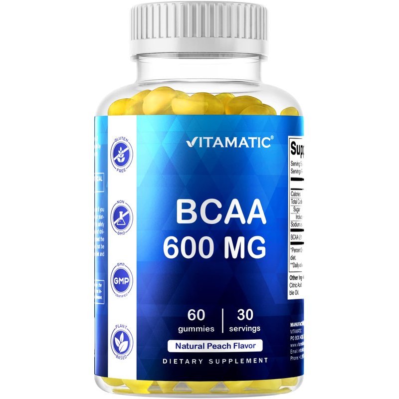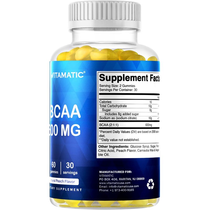 Vitamatic BCAA Gummies - Branch Chain Amino Acid Supplements - Peach Flavor - 600mg per Serving - 60 Vegan Pectin Based Gummies (1 Bottle)