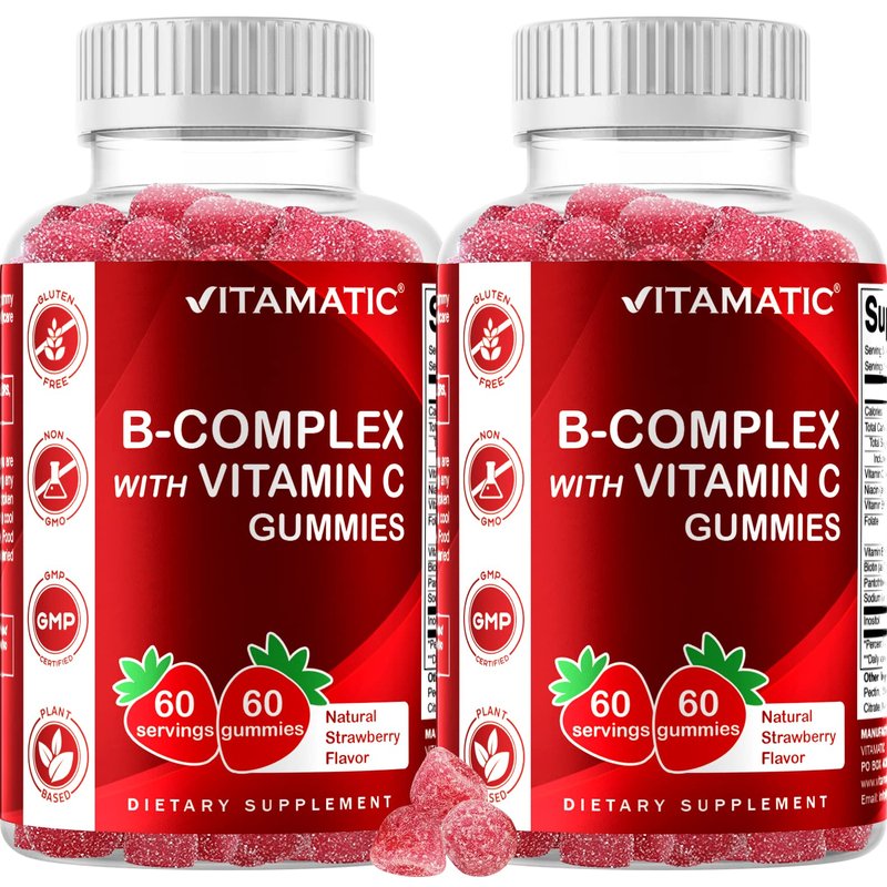 Vitamatic Vitamin B Complex Gummies with Vitamin C & Inositol - Natural Strawberry Flavor - 60 Gummies (2 Bottles)