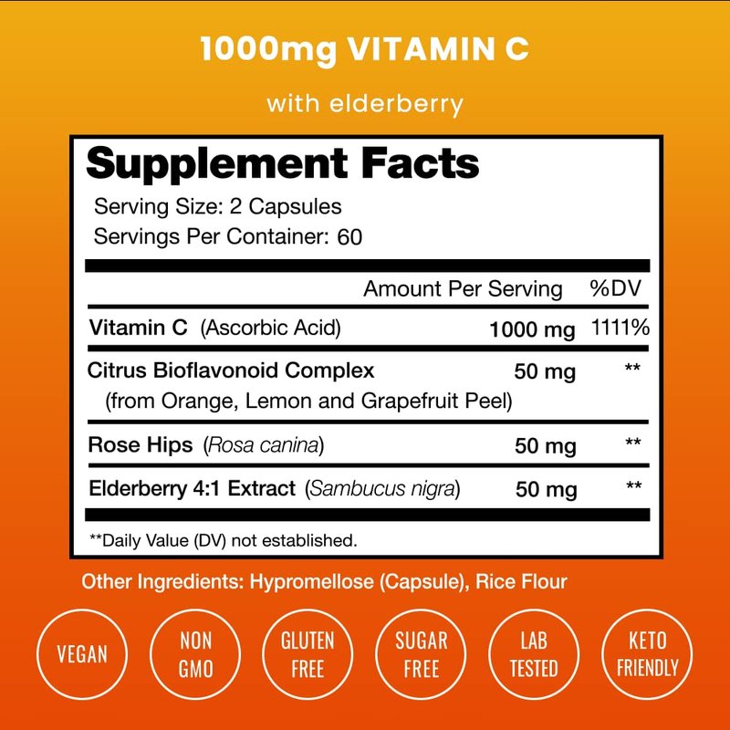 Vitamin C 1000mg with Rose Hips | Vitamin C Supplement with Elderberry & Citrus Bioflavonoids | Kids Immune Boosting Supplement | Non-GMO Antioxidants Supplement | 500mg Vitamin C Capsules Pill