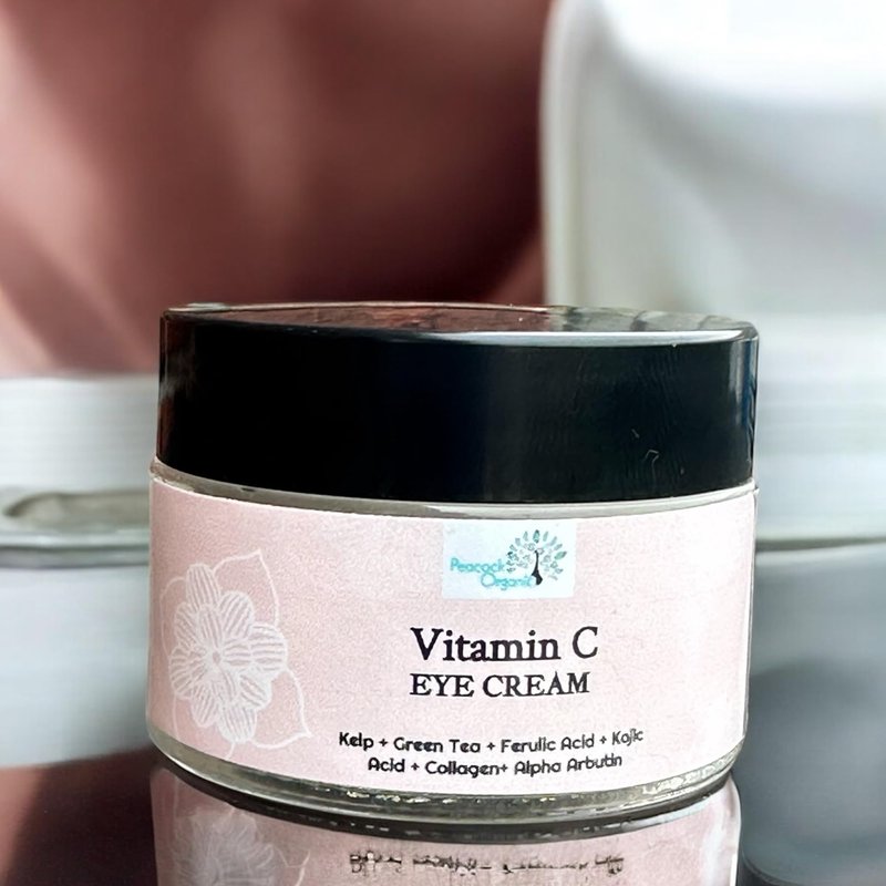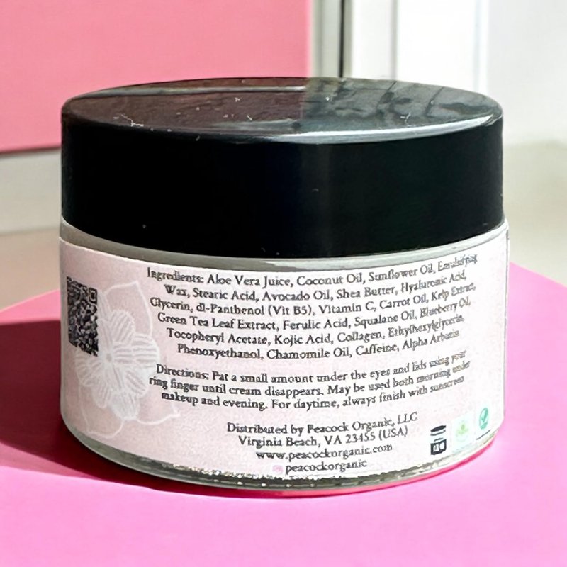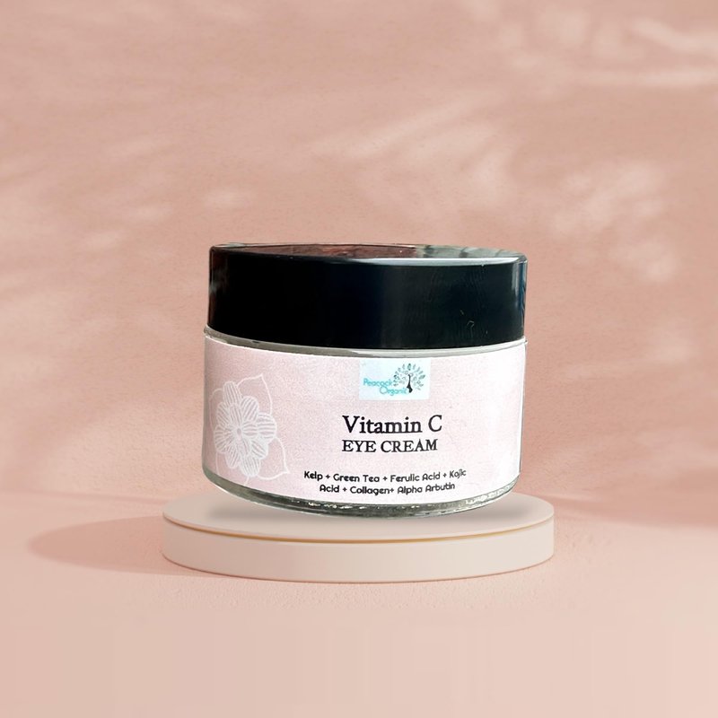 Vitamin C Eye Cream specially formulated to tackle dark circles, fine lines, and discoloration, this luxurious cream is the perfect ally for anyone seeking revitalized and hydrated skin around the eyes. Our eye cream is enriched with a powerful blend of Vitamin C and peptides, designed to combat dullness and improve firmness, giving you visibly brighter and rejuvenated eyes. Infused with organic Aloe Vera, Coconut Oil, and Shea Butter, it soothes and hydrates the delicate skin, reducing puffiness and promoting a smoother appearance. The multi-active ingredient complex featuring Green Tea Extract, Kelp Extract, and Caffeine works to dissolve under-eye deposits, effectively diminishing dark circles and redness for a refreshed look. Safe for sensitive skin, our formula is crafted without harsh chemicals and has been rigorously tested to ensure it meets the highest safety standards. Simply pat a small amount with your ring finger for optimal application.