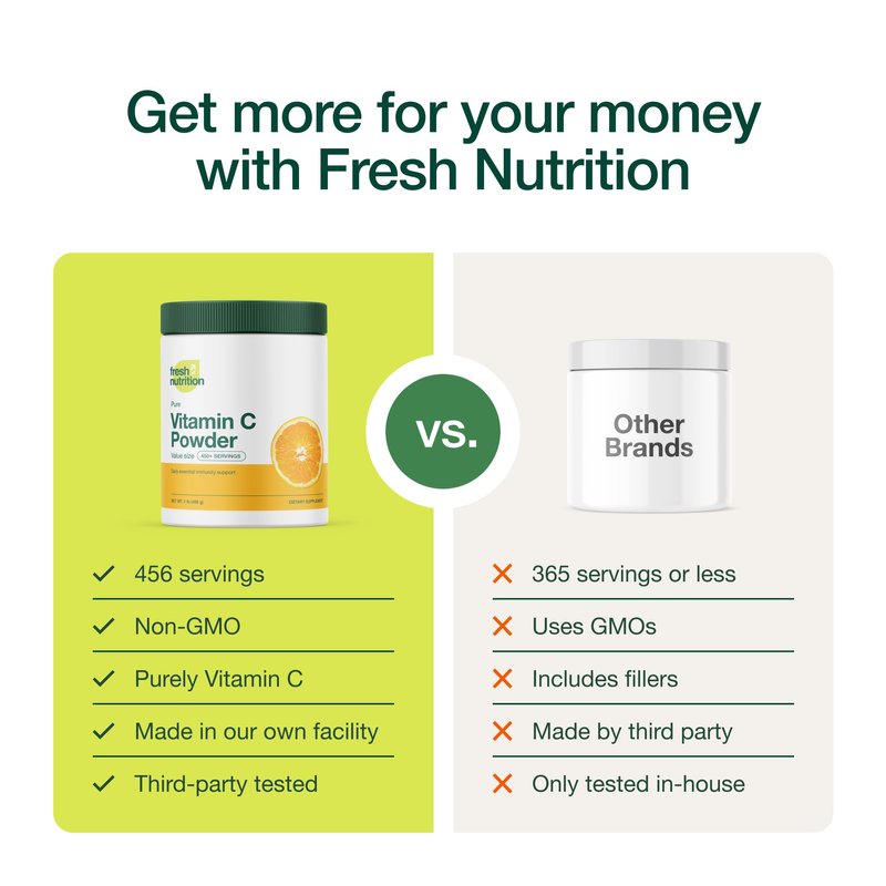 - Incredible value vitamin c powder with a potent dosage of 1,000mg of vitamin C per scoop! Get 456 servings using this serving size, or double your vitamin C intake with two scoops to get 2,000mg and have 228 servings per jar.