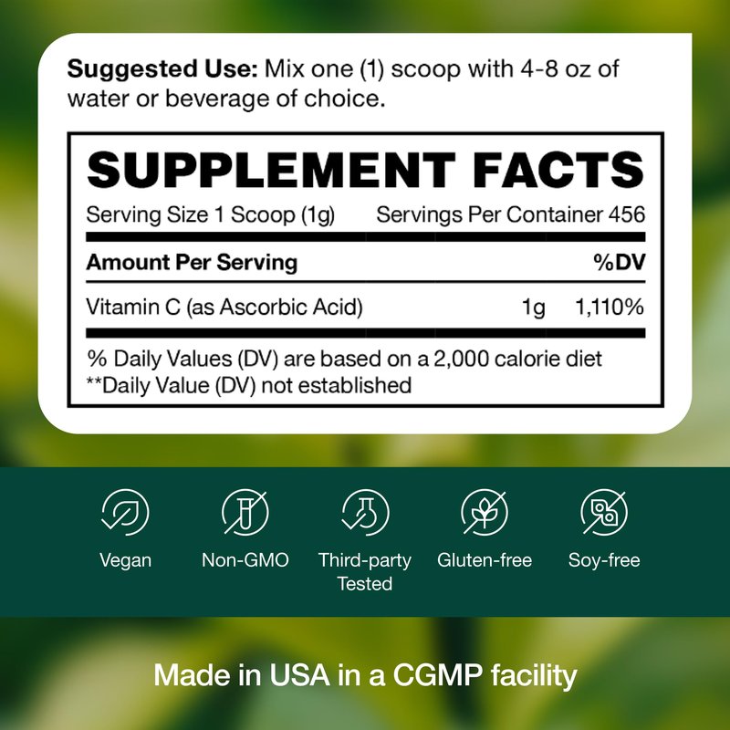 Vitamin C Powder Supplement 1lb – Pure Powerful Immune Support – 1000mg per scoop - Delicious Flavor – Vegan, Non-GMO, Gluten-free - 456 Servings