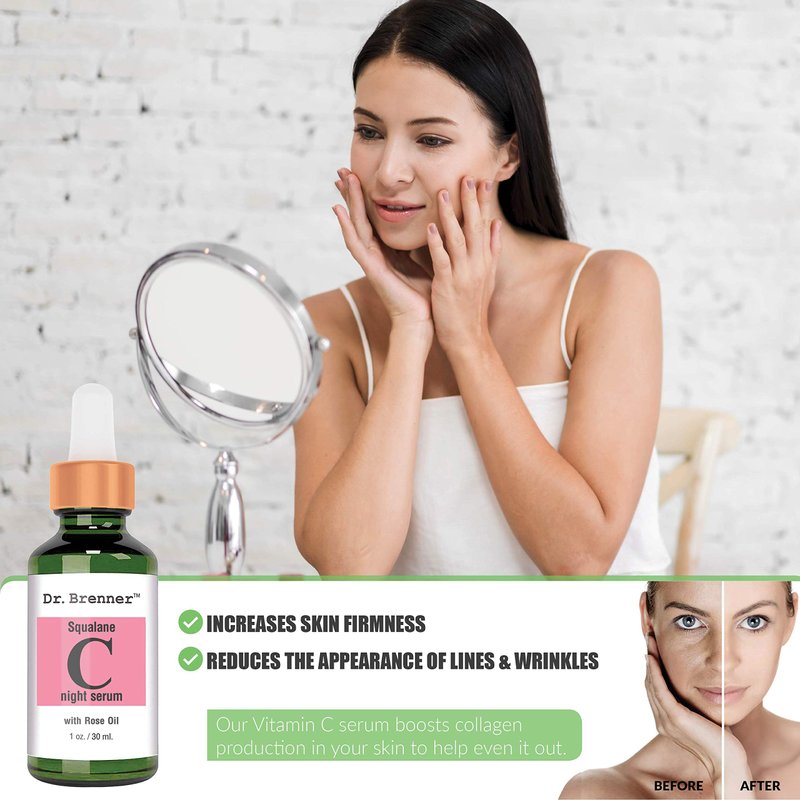 THE MOST EFFECTIVE NIGHT VITAMIN C SERUM FOR FACE DEVELOPED BY A DERMATOLOGIST: Formulated with the same exact ingredients as Biossance Squalane + Vitamin C + Pure Rose Oil . IMPROVES THE APPEARANCE OF DARK SPOTS, WHILE BRIGHTENING SKIN'S COMPLEXION: Our powerful pure Vitamin C serum with Squalane and Rose oil clears skin imperfections, and even helps lighten acne scars. INCREASES SKIN FIRMNESS AND REDUCES THE APPEARANCE OF LINES AND WRINKLES: Our Vitamin C serum boosts collagen production in your skin to help even it out. ALL NATURAL INGREDIENTS, VEGEN, CRUELTY FREE AND MADE IN USA