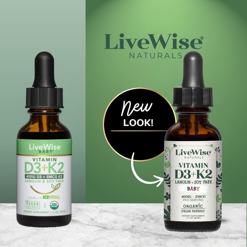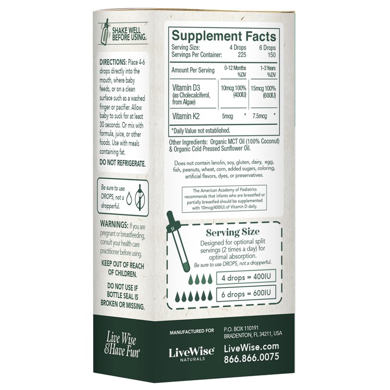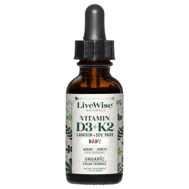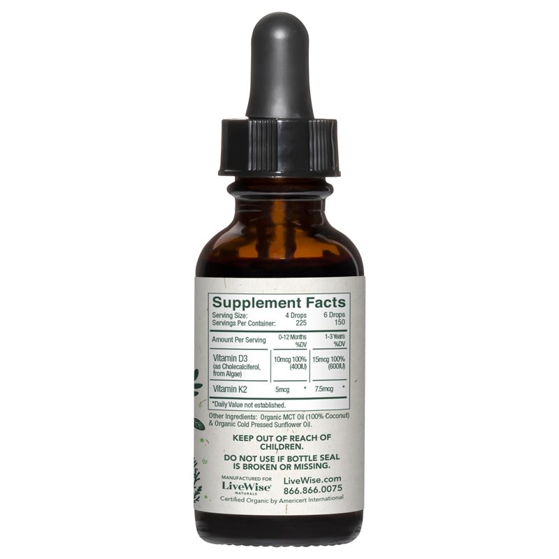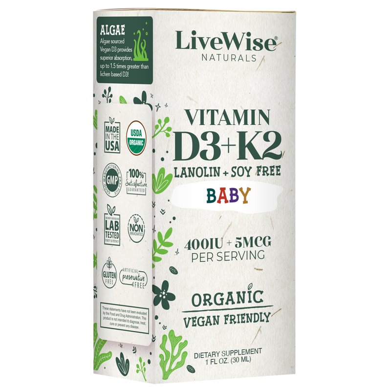Live Wise Naturals Baby D3-K2 utilizes plant-based vitamin D3 from Algae to promote a wide variety of vital functions in your child’s body. Live Wise Naturals Baby D3-K2 is a unique liquid formula specifically for children and developed for those who prefer a form of vitamin D3 that isn't derived from lanolin. This plant-based liquid formula is in the natural form of vitamin D (cholecalciferol), the same form our bodies make from sunlight and the form our bodies absorb best.