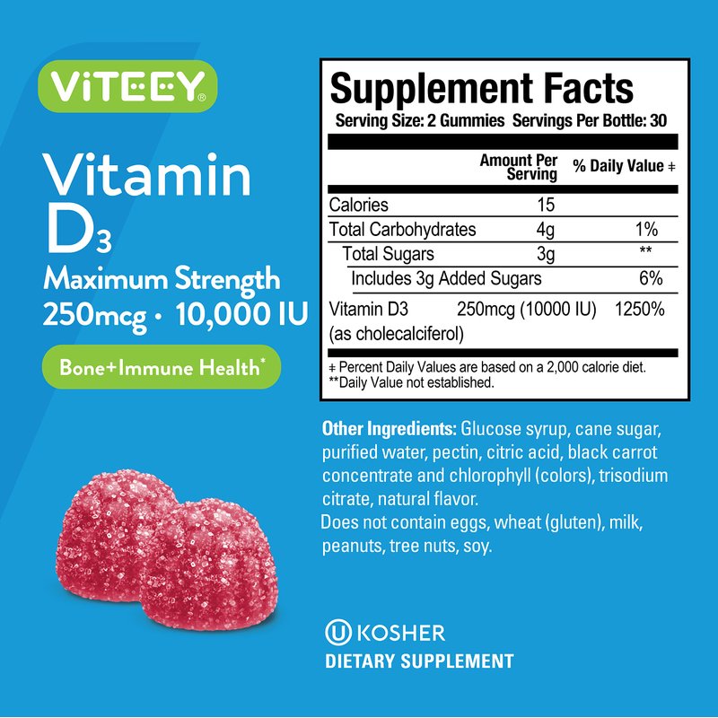 - 60 GUMMIES | 1 MONTH SUPPLY - Made with Vitamin D3 250mcg 10,000 IU - Based on serving size Serving size is 2 gummies, Take 2 to 4 gummies daily for best results. KOSHER CERTIFIED - Produced and formulated to a higher standard.