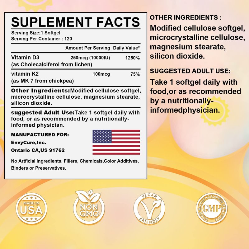 - ➠ BEST PARTNER FOR MAXIMUN ABSORPTION: Viatmin D3 + K2 is the perfect combination to maximize the potency for your overall health. With 10000 IU (250mcg) of Vitamin D3 & 100 mcg of Vitamin K2 as MK-7 in a softgel capsule. Vitamin D3 and K2 work together to optimize calcium absorption and utilization, keeping your bones strong and build muscle strength.