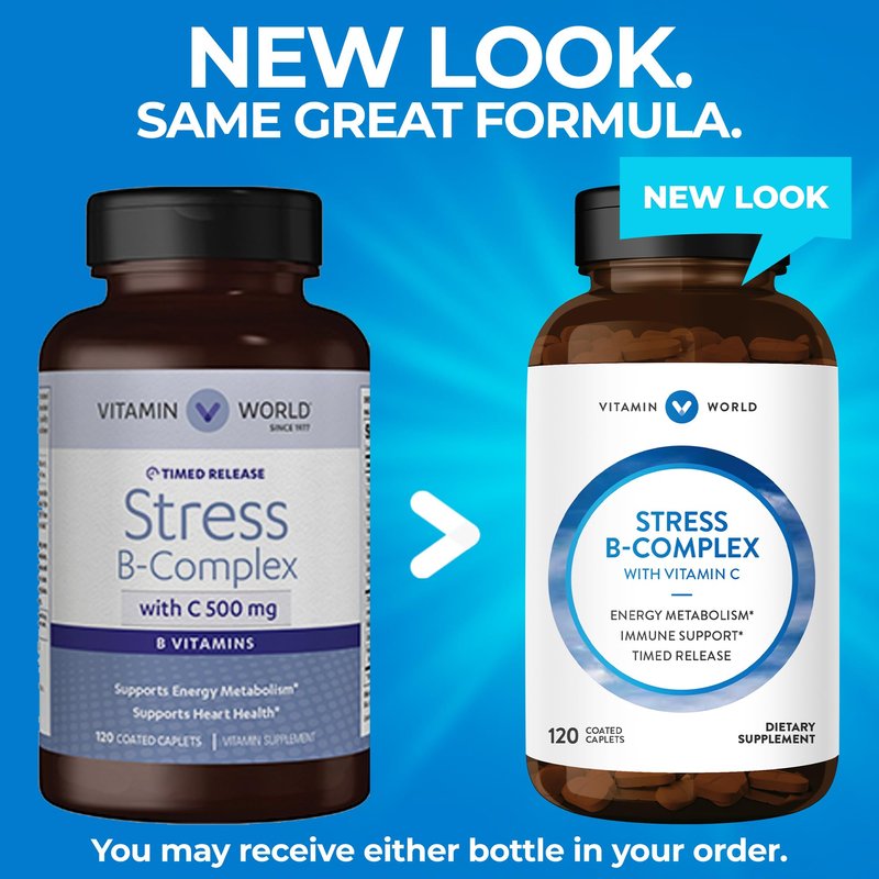 Vitamin World Stress B-Complex with 500 mg. Vitamin C Timed Release 120 Caplets, Vegetarian, Coated, Timed-Release