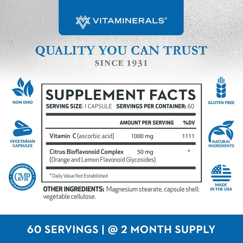 Vitaminerals ® C MAX Antioxidant Support 1,000 mg Vitamin C, with Bioflavanoids - Veggie Capsules (60 Vegetarian Capsules)